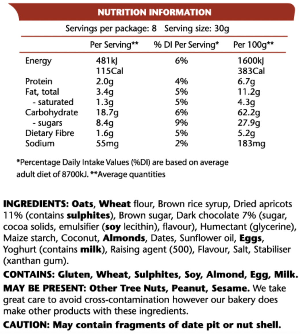 Power up your Day! Our Multipacks of Power Bites are nutritious and delicious snack-sized nuggets of pure energy that lasts. 8x Power Bites per pouch. Great for the lunch box, sporty kids, the office desk, and on-the-go munching. Our Chocolate Oat Explosion is our most popular flavour. It is just so damn good! Similar to the Original Sports Cookie, these Bites are just a little more compact, contain 40% less brown sugar than the Original recipe and are made with healthy sunflower oil. Natural sugars from raisins, coconut and natural yoghurt. Made with sunflower oil and no butter. Allergens: Contains gluten, egg, dairy and soy. May contain sulphites and tree nuts.